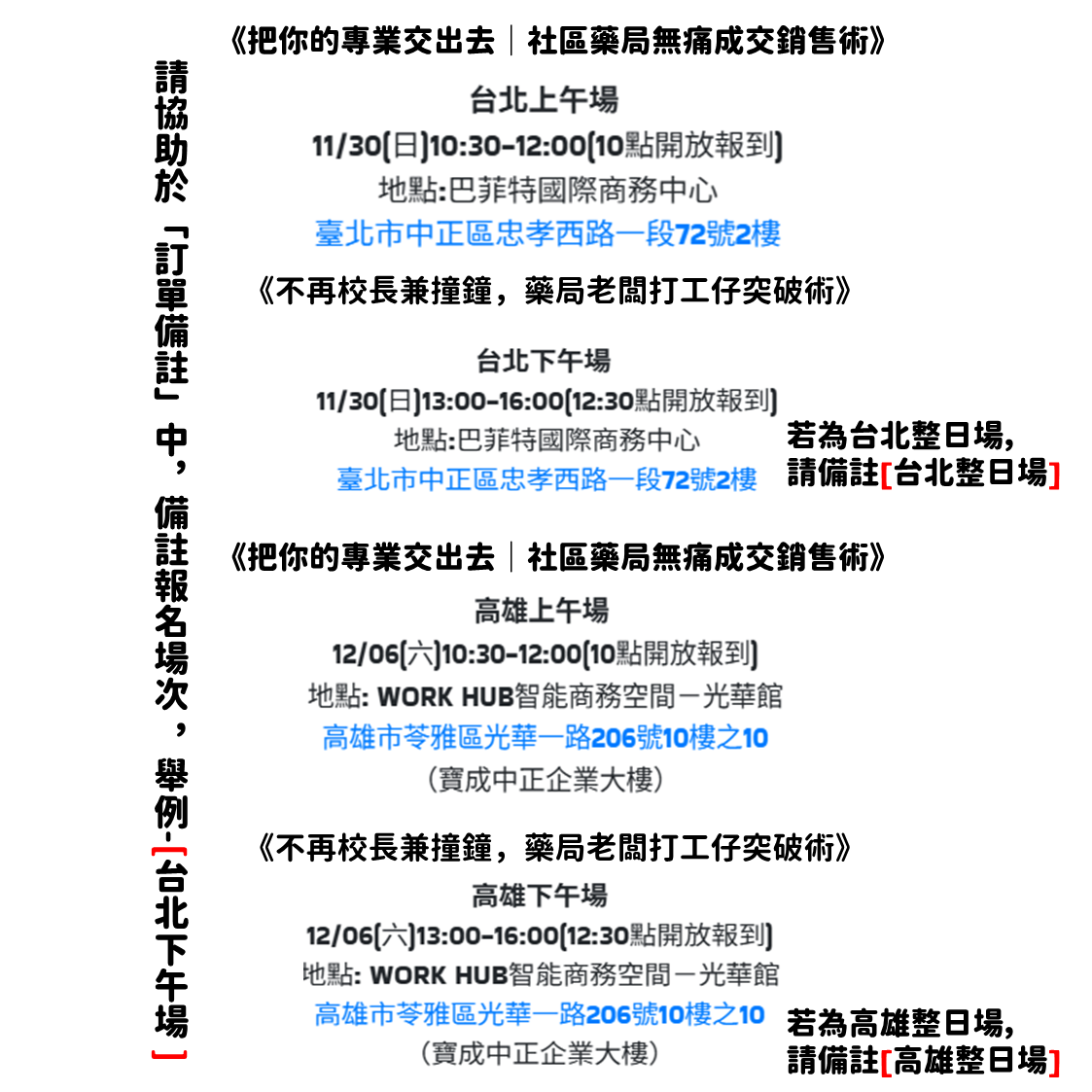 (舉例:報名台北下午場,請在訂單備註註明場次”台北下午場“)